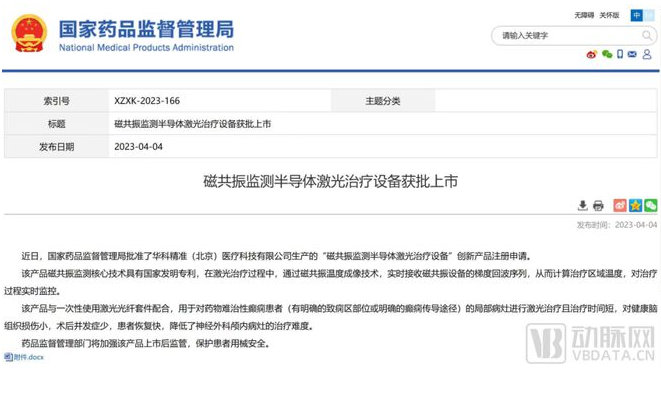 近日,由華科精準(北京)醫療科技有限公司(以下簡稱“華科精準”)自主研發的“磁共振監測半導體激光治療設備”及“一次性使用激光光纖套件”通過國家藥監局NMPA批準上市,用于對藥物難治性癲癇患者(有明確的致癇區部位或明確的癲癇傳導途徑)的局部病灶進行激光治療。