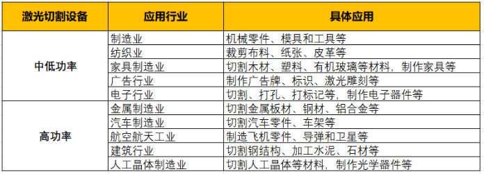 一個激光切割設備標配一套激光切割控制系統,根據《2021中國激光產業發展報告》數據,中國激光切割設備銷售量從2017年的2.73萬套增長到2021年的7.20萬套,2017-2021年CAGR達到27.44%。根據行業報告數據,中國激光切割設備主要用于工業加工、通信存儲、醫療美容等領域,占比分別為45%、28%、9%。其中,中低功率激光切割設備在幾十瓦到幾百瓦之間,通常用于較薄的材料切割;高功率激光切割設備在幾千瓦到數十千瓦之間,適用于較厚的材料切割,以及大規模的工業制造。具體應用如下表: