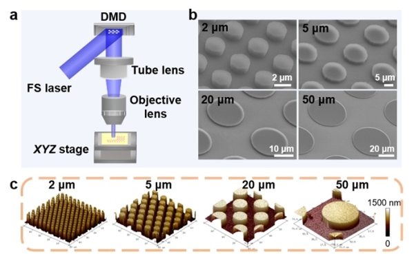 圖1.飛秒激光無掩膜投影光刻示意圖及制備的微盤陣列拓撲結(jié)構(gòu)