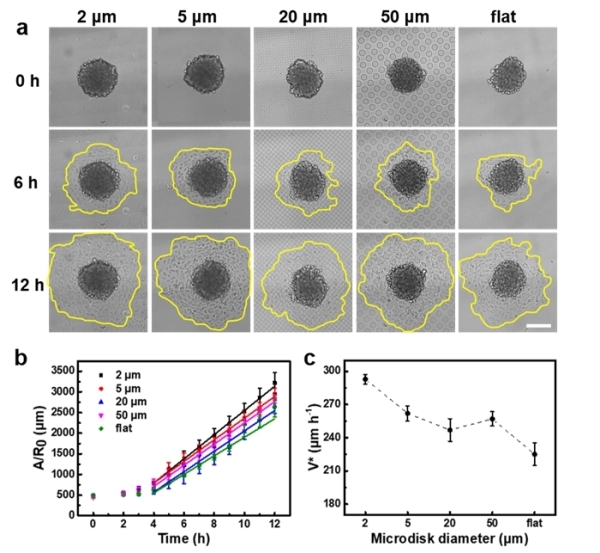 該研究采用超低吸附法制備了大小均一的人腎透明細胞癌細胞的細胞球。進一步,科研人員利用激光掃描共聚焦熒光顯微鏡對細胞球在微盤陣列拓撲結(jié)構(gòu)上的動態(tài)浸潤行為進行觀察。細胞球在一系列微盤陣列拓撲結(jié)構(gòu)上發(fā)生了完全浸潤并展現(xiàn)出不同的浸潤面積。結(jié)合細胞球鋪展理論,通過量化不同時間點的細胞球浸潤面積,研究發(fā)現(xiàn)細胞球的浸潤速度在2、5、50和20 μm直徑的微盤結(jié)構(gòu)單元上依次減小,且細胞球在直徑為20 μm的微盤結(jié)構(gòu)單元上具有較小的細胞-基底黏附能(圖2)。
