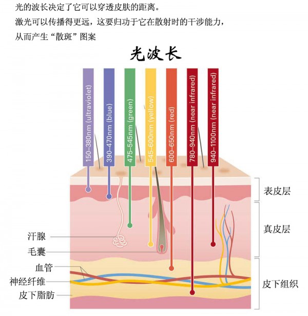 因為一種被稱為“散斑”的現象,激光可以比非相干光更深入皮膚。每當光進入隨機介質(如皮膚)時,它就會被散射和吸收,精確的波長決定了它能傳播多遠(見下圖)。