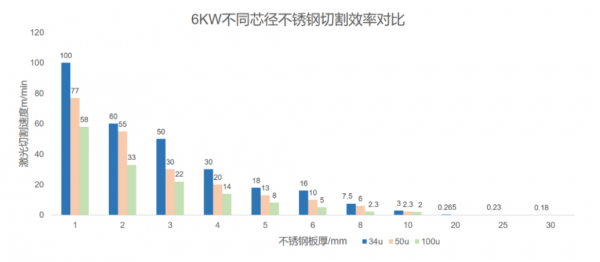相對于傳統多模6KW連續光纖激光器100μm芯徑輸出,切割效率提升明顯。高亮度準單模6KW光學平臺可以實現34μm激光輸出,同時兼容50μm和100μm輸出,滿足不同客戶切割的應用需求,有效節省用戶的綜合運營成本,促進激光切割下游產業升級。