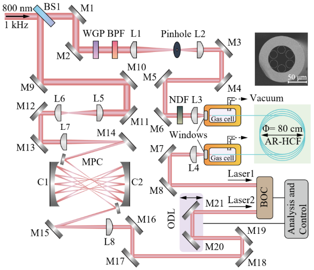 基于超短脈沖激光的高精度同步控制技術已廣泛應用于各種加速器和強激光裝置,極大地提高了大型科學裝置的時間控制精度。高精度時間同步的關鍵是確保超短脈沖激光的長距離穩定傳輸。而傳統的石英光纖難以實現單脈沖能量微焦以上超短脈沖激光的高性能傳輸。這是因為微焦量級的超短脈沖激光具有較高的峰值功率,脈沖在纖芯為熔融石英的光纖中傳輸時會迅速積累過多的非線性,導致脈沖在時域和頻域上失真。