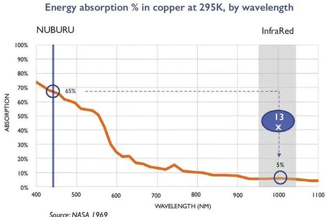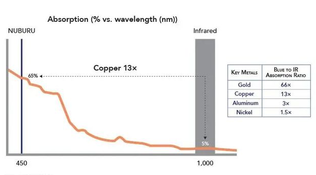 銅是一種重要的經濟材料,它不適合用傳統的紅外工業激光(通常約為 1 μm)進行加工。藍色的好處源于基礎物理學。如下圖所示,銅在紅外波長下僅吸收約百分之五的入射功率。