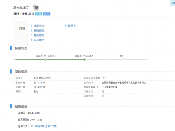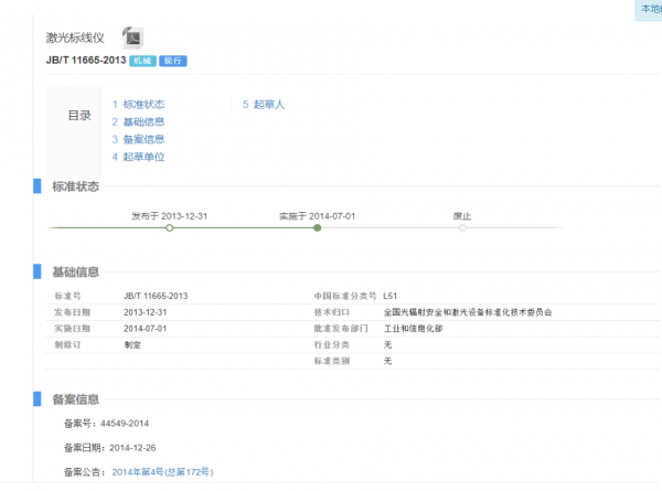 聯(lián)系人:戚燕 聯(lián)系電話:01084321498 聯(lián)系郵箱:mishuchu@tc284.com 標準簡介 《激光標線儀》修訂計劃簡介 《激光標線儀》是由全國光輻射安全和激光設(shè)備標準化技術(shù)委員會(TC284)歸口,由萊賽激光科技股份有限公司,江蘇東成工具科技有限公司,河南省計量科學研究院,浙江省計量科學研究院,中國電子科技集團第十一研究所共同負責起草的機械行業(yè)標準。 本項目是根據(jù) 2022 年 12 月 30 日工業(yè)和信息化部 2022 年第三批標準制修訂計劃和外文版項目計劃的通知(工信廳科[2022]年 312 號),計劃編號 2022-1782T-JB,項目名稱《 激光標線儀》進行修訂,代替 JB/T 11665—2013, 牽頭起草單位:萊賽激光科技股份有限公司,項目周期 18 個月。 1、范圍和主要技術(shù)內(nèi)容 1)范圍 本文件規(guī)定了激光標線儀(以下簡稱儀器)的產(chǎn)品分類、要求、試驗方法、檢驗規(guī)則與標志、包裝、運輸、貯存和隨行文件等。 本文件適用于用波長在400nm~700nm之間的可見半導(dǎo)體激光面標定水平、垂直等基準面的激光標線儀,包括激光投線儀、激光劃線儀等。 2)標準目的和意義 修訂標準將有利于國內(nèi)企業(yè)做大做強。通過修訂,充分納入和反映了當今新產(chǎn)品、新技術(shù)、新工藝的先進技術(shù)成果,保證標準的時效性,為激光標線儀的推廣應(yīng)用提供技術(shù)支撐,進一步推進產(chǎn)業(yè)結(jié)構(gòu)的優(yōu)化升級。對引導(dǎo)和規(guī)范激光標線儀的發(fā)展,提升標準的先進性、合理性和適用性,為提高其技術(shù)水平起到關(guān)鍵性的支撐作用。 本文件為激光標線儀的推廣應(yīng)用提供了有力的技術(shù)支撐,為指導(dǎo)和規(guī)范激光標線儀產(chǎn)品的設(shè)計、制造、驗收提供了依據(jù),有利于提高產(chǎn)品的技術(shù)性能、安全可靠性,有利于進一步促進建筑激光產(chǎn)品產(chǎn)業(yè)的健康有序發(fā)展,同時也有利于避免科技資源的浪費和重復(fù)技術(shù)勞動。 《激光掃平儀》修訂計劃簡介 《激光掃平儀》是由全國光輻射安全和激光設(shè)備標準化技術(shù)委員會(TC284)歸口,由萊賽激光科技股份有限公司,江蘇東成工具科技有限公司,河南省計量科學研究院,浙江省計量科學研究院,中國電子科技集團第十一研究所共同負責起草的機械行業(yè)標準。 本項目是根據(jù) 2022 年 12 月 30 日工業(yè)和信息化部 2022 年第三批標準制修訂計劃和外文版項目計劃的通知(工信廳科[2022]年 312 號),計劃編號2022-1784T-JB,項目名稱《激光掃平儀》進行修訂,代替 JB/T 11666-2013,牽頭起草單位:萊賽激光科技股份有限公司,項目周期 18 個月。 范圍和主要技術(shù)內(nèi)容 1)范圍 適用于用波長在400nm~700nm之間的可見半導(dǎo)體激光束通過旋轉(zhuǎn)標定水平、垂直等基準面的激光掃平儀,包括旋轉(zhuǎn)激光儀等。 2)標準目的和意義 激光掃平儀系列產(chǎn)品在我國發(fā)展至今,已經(jīng)具備了完整的技術(shù)基礎(chǔ)、產(chǎn)業(yè)基礎(chǔ)和市場基礎(chǔ),隨著激光掃平儀的大規(guī)模應(yīng)用以及應(yīng)用過程中的現(xiàn)實需求,出現(xiàn)了帶坡度功能(標定傾斜面)的激光掃平儀(一種利用機械結(jié)構(gòu)標定坡度,另一種利用芯片式角度傳感器標定坡度)。 修訂此標準有助于增強標準的普適性,也有助于建筑激光產(chǎn)品產(chǎn)業(yè)升級,淘汰落后技術(shù)、產(chǎn)能,節(jié)能減排。有助于提高國內(nèi)廠商在國際市場上的競爭力。 通過修訂,充分納入和反映了當今新產(chǎn)品、新技術(shù)、新工藝的先進技術(shù)成果,保證標準的時效性,為激光掃平儀的推廣應(yīng)用提供技術(shù)支撐,進一步推進產(chǎn)業(yè)結(jié)構(gòu)的優(yōu)化升級。對引導(dǎo)和規(guī)范激光掃平儀的發(fā)展,提升標準的先進性、合理性和適用性,為提高其技術(shù)水平起到關(guān)鍵性的支撐作用。 本文件為激光掃平儀的推廣應(yīng)用提供了有力的技術(shù)支撐,為指導(dǎo)和規(guī)范激光掃平儀產(chǎn)品的設(shè)計、制造、驗收提供了依據(jù),有利于提高產(chǎn)品的技術(shù)性能、安全可靠性。
