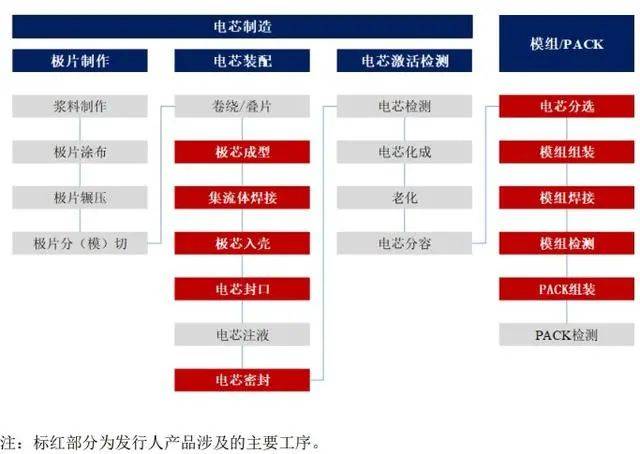 按照應用領(lǐng)域劃分,公司主營產(chǎn)品可分為鋰電池制造設(shè)備(以下簡稱“鋰電設(shè)備”)及其他領(lǐng)域制造設(shè)備,其中鋰電設(shè)備收入占比較高。鋰電池的生產(chǎn)可分電芯制造和模組/PACK 兩大環(huán)節(jié),其中電芯制造包含極片制作(前段)、電芯裝配(中段)和電芯激活檢測(后段)三大工序。公司鋰電設(shè)備產(chǎn)品主要用于電芯裝配階段和模組/PACK 階段,具體情況如下: