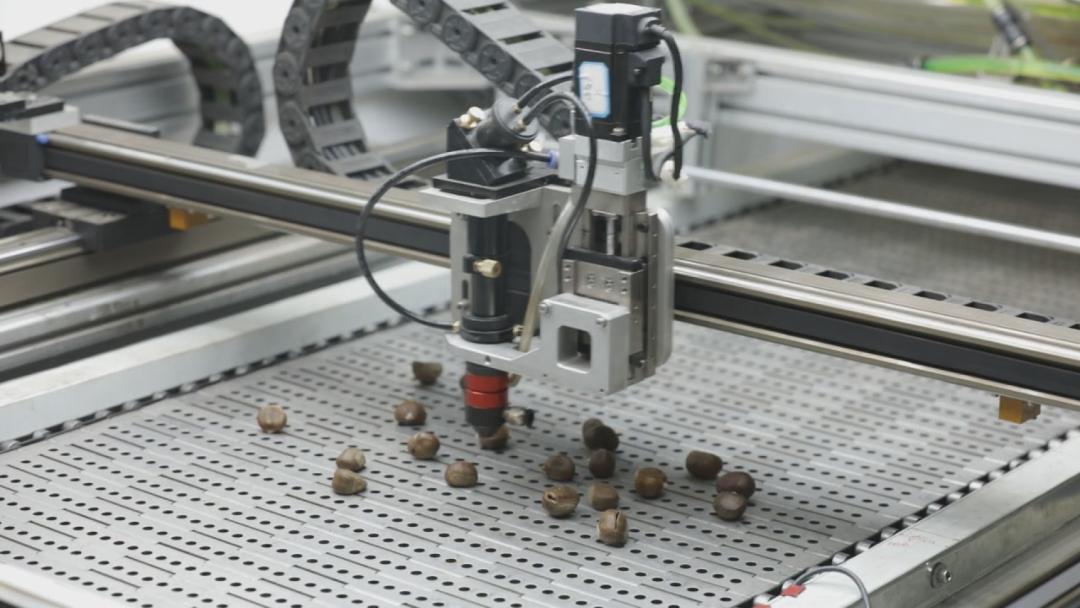 在生產(chǎn)車間內(nèi),小葵花看到,新研發(fā)的AI智能板栗激光切口機正在技術(shù)人員的操作下穩(wěn)定運轉(zhuǎn)。新鮮的板栗在傳送帶上進(jìn)行視覺掃描并調(diào)整姿態(tài),經(jīng)過激光刀頭就可以實現(xiàn)板栗的智能切口。