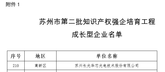 近日,蘇州市市場監督管理局公布了蘇州市第三批知識產權重點企業保護名錄,經過嚴格篩選,長光華芯成功入選。