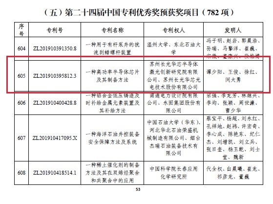 近期,第二十四屆中國專利獎獲獎項目公布,蘇州長光華芯半導體激光創新研究院有限公司與蘇州長光華芯光電技術股份有限公司的一項發明專利榮獲本次“中國專利優秀獎”。