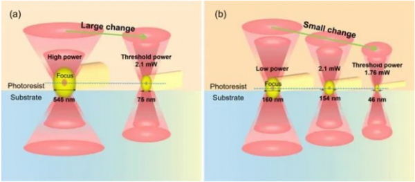 在幾十納米尺度的分辨率中,體素相對于基底的位置是不可忽略的影響因素。為了進一步提高結構分辨率,該團隊根據激光焦點體素理論調控焦點與基底相對位置從而獲得更高分辨率的線結構。如圖2所示,大功率激光焦點光斑明亮,并且體素體積較大,不易得到最佳焦點位置,而小功率激光焦點光斑較弱,體素體積更小,更容易獲得最佳焦點位置,基于此方法獲得了更高分辨率的線結構。