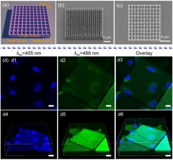 綜上所述,研究團隊全面研究了HAVE水凝膠光刻膠的雙光子聚合性能,通過優化光刻膠前驅體的配方和調節焦點位置,獲得了22 nm的特征線寬,并驗證了材料和3D水凝膠細胞支架的生物相容性。本研究提出的方案有望創建復雜的生物相容性3D水凝膠結構,并探索其在個性化微環境調控、組織工程、生物醫學和仿生科學領域的潛在應用。
