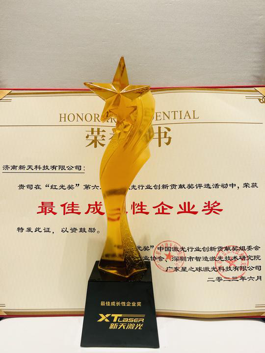 新天激光憑借其銳意進取的企業創新活力,激光行業的綜合實力及卓越的品牌影響力,從全球眾多參選企業中脫穎而出,榮獲2023年度第六屆紅光獎“最佳成長性企業”榮譽。