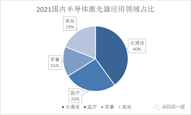 在半導(dǎo)體激光器行業(yè)下游終端應(yīng)用市場(chǎng)中,通信、醫(yī)療和軍事都是最主要的應(yīng)用領(lǐng)域,經(jīng)過多年的發(fā)展,行業(yè)下游環(huán)節(jié)逐步形成了穩(wěn)定的發(fā)展格局,目前通信領(lǐng)域所占的需求量較其他終端應(yīng)用市場(chǎng)高,2021年市場(chǎng)占比達(dá)40%;其次為醫(yī)療和軍事應(yīng)用領(lǐng)域分別占比26%和15%,除此之外其他廣泛應(yīng)用的領(lǐng)域合計(jì)占比19%。