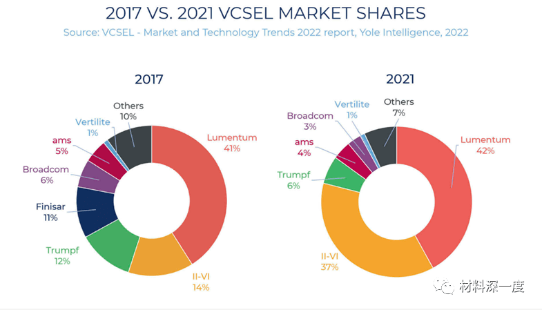 2017年以來,VCSEL市場(chǎng)是寡頭壟斷,Lumentum是當(dāng)時(shí)蘋果唯一合格的供應(yīng)商,主要由Lumentum主導(dǎo)。到2022年,Coherent(II-VI)收購了Finisar。Lumentum和II-VI這兩家公司是獲得蘋果3D傳感資格的企業(yè)。VCSEL變成了雙頭壟斷。Lumentum和Coherent現(xiàn)在是最大的市場(chǎng)擁有者,總計(jì)占有80%的VCSEL市場(chǎng)。