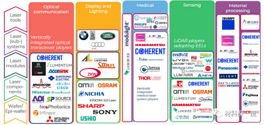 EEL市場(chǎng)是高度分散的。大多數(shù)EEL制造商都是垂直整合的,即在內(nèi)部進(jìn)行外延、前端線尾(FEOL)處理、包括與激光二極管組件的圖樣相關(guān)所有制程步驟,以及后端線尾(BEOL)制程,包括互連和封裝。邊發(fā)射激光器供應(yīng)商有艾邁斯歐司朗、Coherent、Lumentum、Cisco、海信、長光華芯等企業(yè),下游主要應(yīng)用企業(yè)包括光學(xué)通訊、顯示照明、醫(yī)療、傳感、和材料加工四大領(lǐng)域。