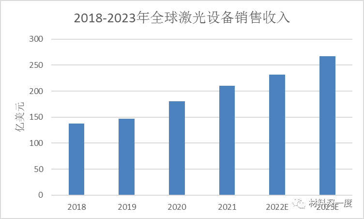 激光設(shè)備是集合多種先進(jìn)技術(shù)的高科技終端設(shè)備,該行業(yè)是目前各國最為關(guān)注和發(fā)展最為迅速的行業(yè)之一。近年來,全球激光產(chǎn)業(yè)市場(chǎng)發(fā)展迅猛,并帶動(dòng)激光設(shè)備產(chǎn)業(yè)收入增長。據(jù)《2022中國激光產(chǎn)業(yè)發(fā)展報(bào)告》,2021年全球激光設(shè)備市場(chǎng)銷售收入約為210.1億美元,2018-2021年年均復(fù)合增長率約為15.15%,預(yù)計(jì)2023年全球激光設(shè)備市場(chǎng)銷售收入將達(dá)到267.2億美元。