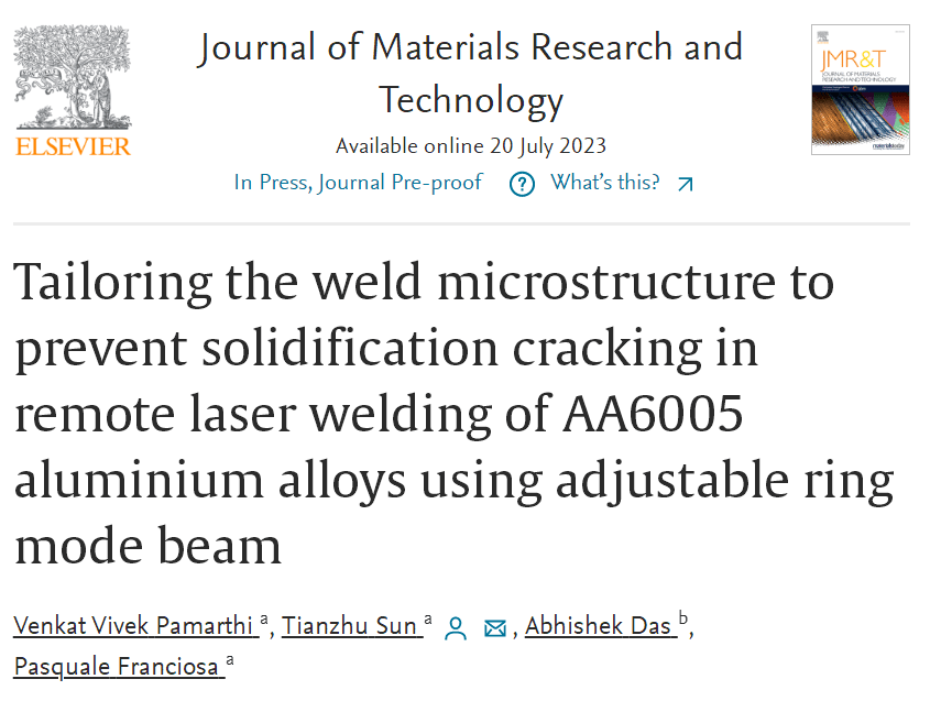 英國(guó)沃里克大學(xué)、印度理工學(xué)院一組研究團(tuán)隊(duì)采用可調(diào)環(huán)模式光束對(duì)AA6005鋁合金遠(yuǎn)程激光焊接中焊縫微觀結(jié)構(gòu)進(jìn)行調(diào)整,防止凝固開(kāi)裂。相關(guān)研究成果以“Tailoring the weld microstructure to prevent solidification cracking in remote laser welding of AA6005 aluminium alloys using adjustable ring mode beam”為題發(fā)表在《Journal of Materials Research and Technology》上。