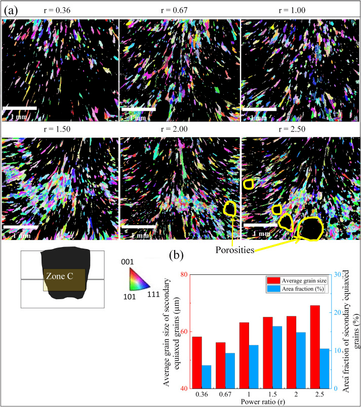 C區(qū)表現(xiàn)為在熔合區(qū)底部形成二次等軸晶粒,觀察到其取向是隨機(jī)的。圖10 (a)示出了在平均晶粒尺寸為30 μm到最大平均晶粒尺寸為50 μm的晶粒上用濾光片配制的結(jié)晶圖。另一方面,圖10 (b)總結(jié)了不同功率比下C區(qū)平均晶粒尺寸和二次等軸晶粒面積分?jǐn)?shù)的發(fā)展情況。這表明功率比的增加導(dǎo)致晶粒尺寸的輕微增大,但值得注意的是,在C區(qū)觀察到的晶粒比在A區(qū)觀察到的晶粒更細(xì)。