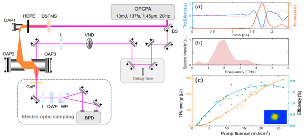 太赫茲波因獨特的頻率和時間特性,在基礎科學研究以及信息等應用領域具有重要價值。當太赫茲場強達到MV/cm量級,可以實現對材料物性的超快調控,包括調控電子、聲子、自旋等基礎物性以及誘導材料相變等。長期以來,強場太赫茲波的產生技術匱乏是限制其廣泛應用的主要因素。隨著激光技術的發展,超短脈沖激光驅動晶體中的光整流效應,為強場太赫茲波的產生提供了可靠方案。