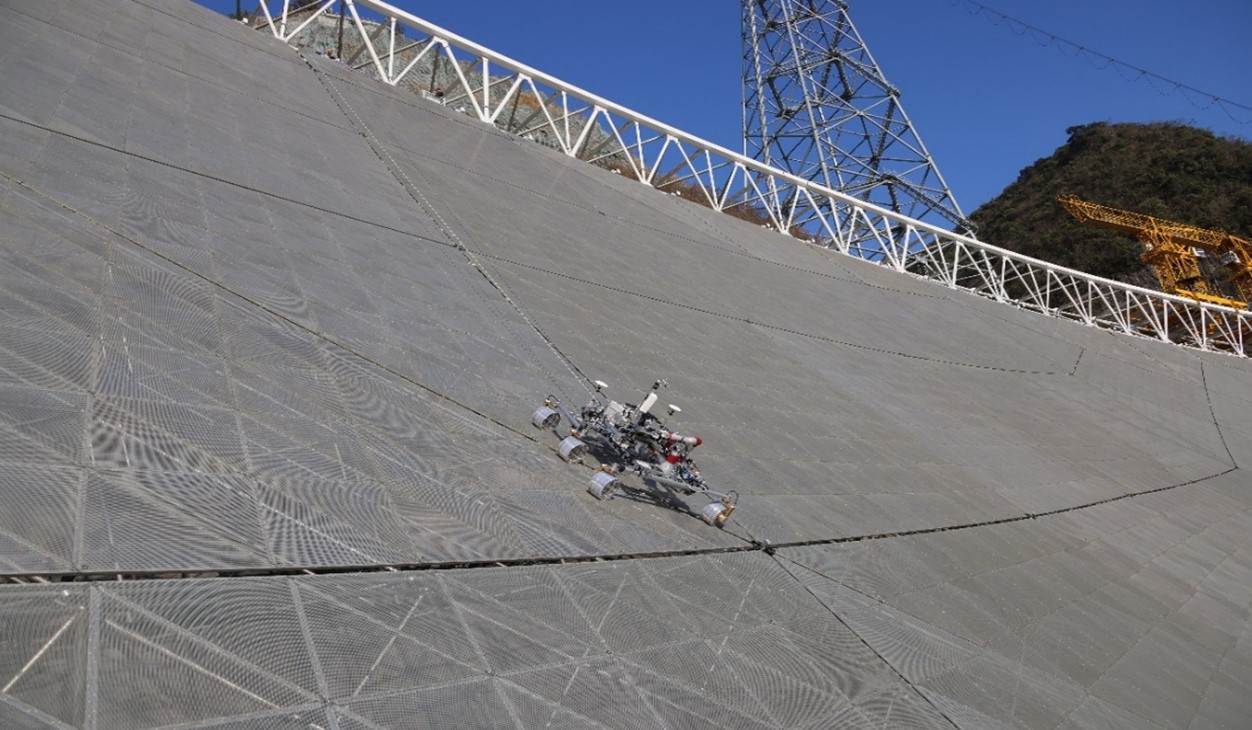 五百米口徑球面射電望遠鏡(FAST)是世界上單體口徑最大、觀測精度最高的射電望遠鏡。在FAST的反射面上分布了2225個激光靶標,是其控制系統的重要組成部分,宛如反射面的“眼睛”,需要定期維護和更換。然而,反射面由厚度僅為1mm的鋁板構成,難以承受一個正常成年人的重量,目前主要依賴“微重力蜘蛛人”進行人工維護,存在維護效率低、安全性差、難以維護大坡度環境下的靶標等缺點。