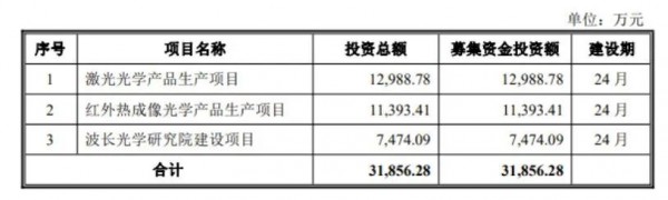 根據招股書披露,本次發行募集資金扣除發行費用后,將用于投資以下項目:1.30億元用于激光光學產品生產項目,1.14億元用于紅外熱成像光學產品生產項目,7474.09萬元用于波長光學研究院建設項目,募集資金投資額合計3.19億元。