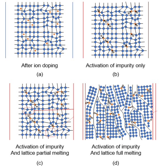 活化過程的機制可以通過分析吸收激光能量后雜質的釋放和再結晶來解釋,如圖6所示。結果表明,在不同能量的激光照射下,硅薄膜電阻的變化與晶體狀態的變化是一致的。在圖3中,第一次減少可能是由于雜質的釋放而不改變晶格。激光輻照功率越大,雜質釋放量越大,薄片電阻越低。在所有雜質釋放后,釋放量沒有增加,因此阻力首先飽和。當激光功率進一步提高時,硅晶體部分熔化再結晶,熔化導致晶格缺陷,載流子遷移率下降,導致片電阻增大。隨著激光輻照能量的增加,合金的熔融再結晶率和晶粒尺寸逐漸增大,最終達到完全熔融和再結晶后的側向結晶。遷移率隨晶粒尺寸的增大而增大,薄片電阻隨激光能量的增大而減小。遷移率在橫向區域飽和,因此薄片電阻飽和。