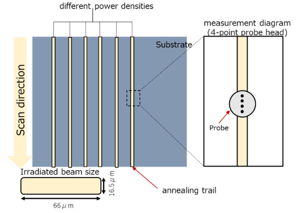 圖2顯示了激光束形狀、用于表面電阻測量和四針電阻測量的條帶。采用HIOKI 3239 DIGITAL HiTESTER進行電阻測量。