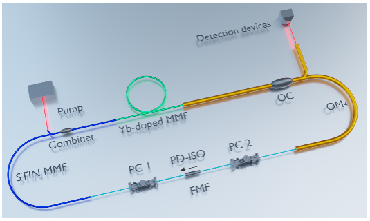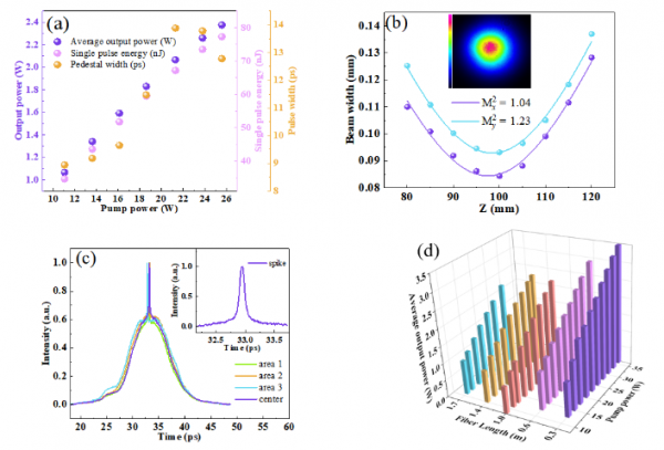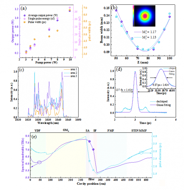 近日,北京交通大學物理科學與工程學院激光研究所鄭義、彭繼迎團隊與北京郵電大學電子工程學院肖曉晟課題組合作,在時空鎖模方面取得了重要進展。合作團隊基于多模增益光纖和無源光纖,研制了一種結構簡單的高光束質量高功率全光纖時空鎖模激光器,激光器可分別工作在多模耗散孤子鎖模和類噪聲脈沖鎖模狀態。該研究為時空鎖模激光的研究和應用打開了一個新的窗口,為高功率高光束質量超短脈沖光纖激光器提供了一種新的實現方法。相關研究成果以“Investigation of High‐Power Spatiotemporal Mode‐Locking with High Beam Quality”為題,于2023年7月20日在線發表于Laser & Photonics Reviews上。北京交通大學物理科學與工程學院博士生張懷偉為論文第一作者,北京交通大學物理科學與工程學院彭繼迎和北京郵電大學電子工程學院肖曉晟為論文共同通信作者。2017年時空鎖模首次被提出,而后迅速成為鎖模激光領域的研究熱點。時空鎖模即多橫模和縱模的同時鎖定。由于多模光纖額外的空間自由度,時空鎖模激光器不僅成為研究復雜非線性時空動力學的平臺,而且有望實現高功率高能量脈沖輸出,為實用化大功率超短脈沖振蕩器的研制提供切實可行的方案。因此,無論是從基礎科學還是應用角度研究時空鎖模激光器都有著重要的意義。目前,對時空鎖模的報道主要集中在基礎科學如非線性動力學的研究等方面,而如何將時空鎖模激光器實用化,亟待研究。從應用的角度,如何利用多模增益光纖的優勢,在全光纖、結構簡單的激光器中實現高穩定高功率鎖模的運轉,同時克服散斑畸變實現高光束質量輸出,具有重要的研究價值,但同時也具有很大的挑戰性。在本工作中,研究團隊提出利用光纖自身或光纖續接時產生的濾波功能構建“虛擬濾波器”結構,采用階躍折射率多模增益光纖減小非線性,并且巧妙運用多模光纖中的自清潔效應,使得時空鎖模、高功率、高光束質量機制互通、相互支撐,設計了一個結構簡單的全正色散多模腔,在鎖模激光器中實現了對場的時空控制。實驗裝置如圖1所示。圖1 實驗裝置。Yb-doped MMF,增益光纖(20/125);OM4 ,漸變折射率多模光纖(50/125);PD-ISO,偏振相關隔離器;FMF,少模光纖(10/125);STIN MMF,階躍折射率多模光纖當泵浦功率相對較低時,時空鎖模激光器工作在耗散孤子狀態。時空鎖模的最大平均輸出功率高達1.16 W;輸出光束輪廓的Mx2 = 1.18,My2 = 1.13。輸出脈沖可以去啁啾到137 fs。此外,利用多模非線性薛定諤方程建立模型,仿真研究了腔內脈沖的演化過程,如圖2所示。圖2 耗散孤子狀態下,激光器的輸出參數和相應的腔內脈沖時域和頻域演化的數值模擬如圖3所示,時空鎖模激光器工作在類噪聲脈沖狀態時,最大平均輸出功率為2.37 W,輸出光束輪廓的Mx2 = 1.18,My2 = 1.13。研究人員進一步發現,通過減小腔內少模光纖長度,在保持高質量的輸出光束輪廓的同時,可以將最大平均輸出功率提升至3.48 W。