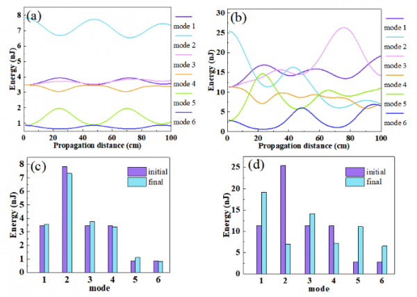 圖3 (a) (b) (c)類噪聲脈沖狀態下,激光器的輸出參數。(d)隨少模光纖長度減少,輸出功率的變化研究人員認為,高質量光束的形成是因為高功率脈沖在多模光纖中傳輸時,在腔內誘導了克爾光束自清潔效應,并且采用數值模擬研究了這一現象,如圖4所示。光束自清潔促使高階模能量耦合到基模,又反過來促進振蕩器高功率運轉時的穩定,高功率和高光束質量機制互通、相互支撐。