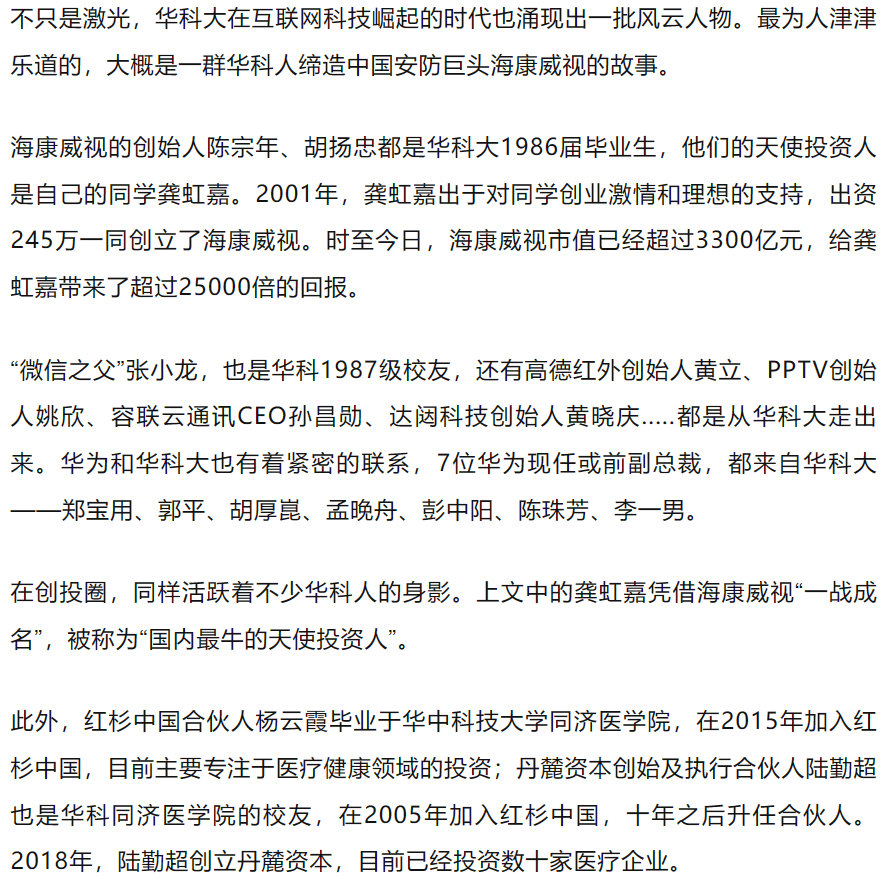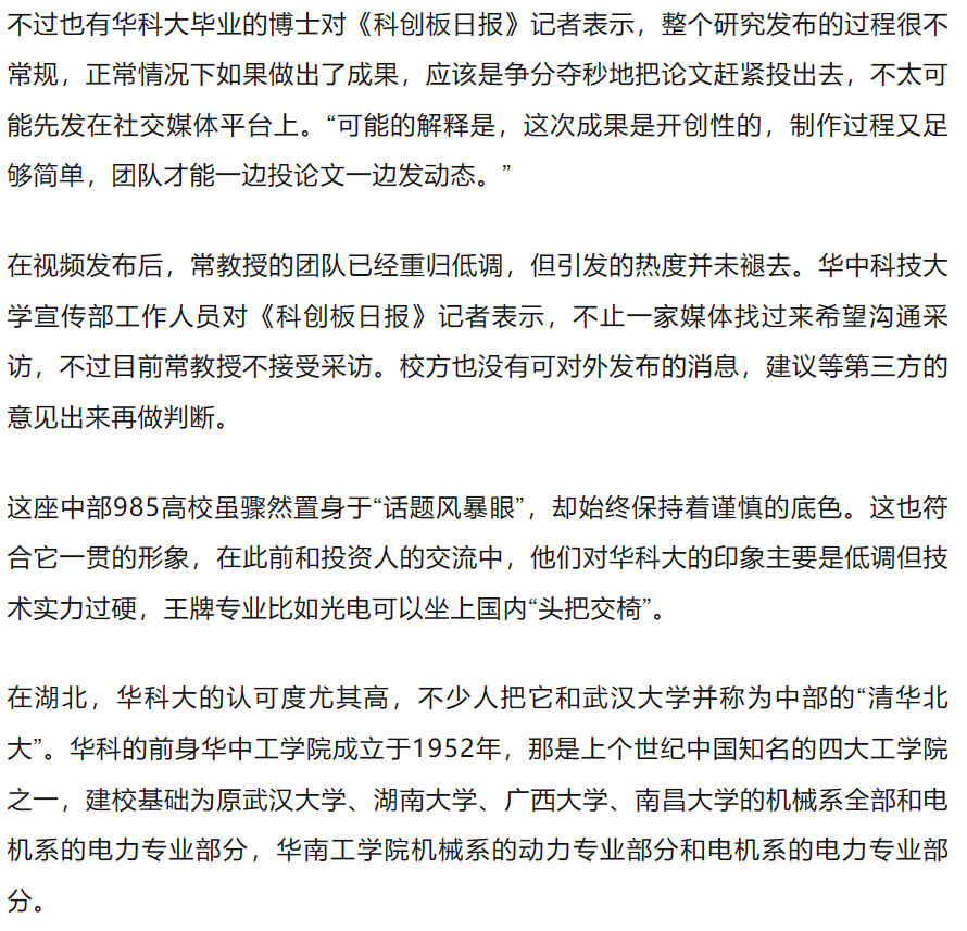 “火出圈”的華科大也成了創(chuàng)投圈關(guān)注的焦點。一位北京的國資CVC投資人對《科創(chuàng)板日報》表示,正在找華科大的團隊了解情況,后面可能會直接去趟學(xué)校。另外也有媒體稱華科畢業(yè)的硬科技投資者發(fā)起了一個專門的材料創(chuàng)投社群,計劃邀請百名華科大材料、光電領(lǐng)域的研發(fā)專家、硬科技投資者。