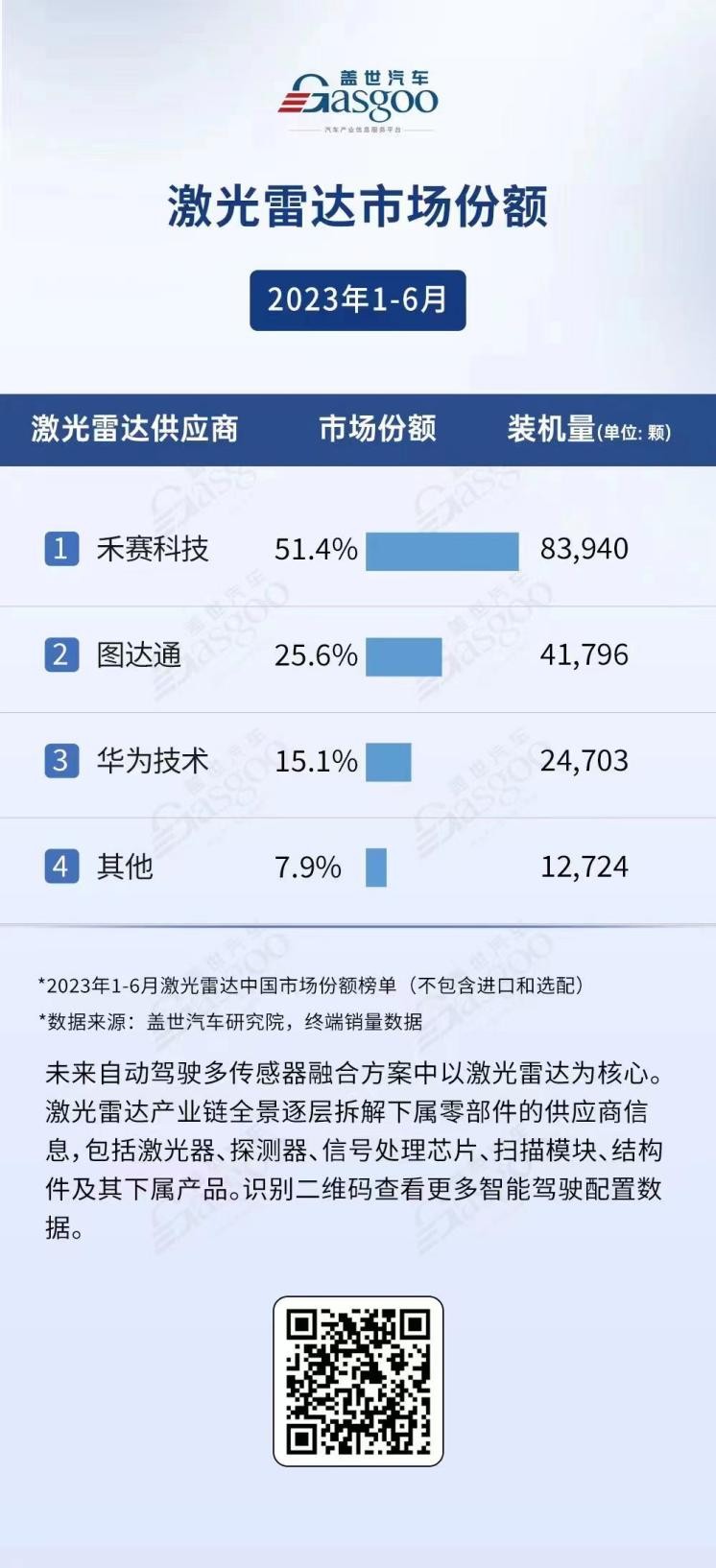 2023年上半年,禾賽科技表現亮眼,在中國車載激光雷達市場榮登市場份額第一的寶座。根據蓋世汽車研究院的數據,2023年1月至6月,禾賽科技在中國市場的激光雷達銷售份額高達51.4%,裝機量達83940顆。