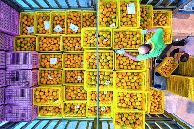 在湖北秭歸縣臍橙文旅小鎮(zhèn)數(shù)字化電商中心,工作人員將夏橙裝車。新華社發(fā)