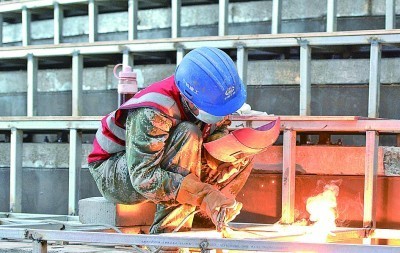 工人在北京城市副中心圖書館項目施工現(xiàn)場施工。新華社發(fā)