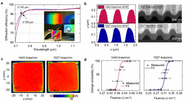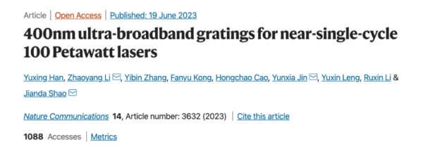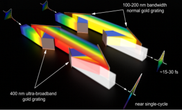 近期,中國科學院上海光學精密機械研究所邵建達研究員、晉云霞研究員團隊和張江實驗室李朝陽研究員在超寬帶脈沖壓縮光柵領域取得突破性進展。研究團隊針對單周期脈沖壓縮需求,成功研制超400 nm寬帶金光柵,其在750-1150 nm 的波長范圍內衍射效率大于90%,比現役金光柵帶寬提升近一倍,并且其研制口徑可進一步推向米量級。相關成果以“400nm ultra-broadband gratings for near-single-cycle 100 Petawatt lasers”為題發表于《自然-通訊》。 拍瓦激光器的脈沖寬度從目前10-20個周期壓縮到單周期(3.3 fs)結合大能量的載入被認為是實現艾瓦激光的未來。研究團隊長期深耕于寬帶高閾值脈沖壓縮光柵領域。在本項工作進展中,超寬帶金光柵的仿真設計取得突破,引入方位角擴展了設計和應用自由度;實驗上掌握了光柵槽形演化規律,發明了大底寬小尖角金光柵技術(專利號:CN114879293B),成功研制1443 g/mm和1527 g/mm超400 nm寬帶金光柵(圖1)。如此寬帶和高閾值(優于0.3J/cm2)的超寬帶光柵將在寬角非共線光參量啁啾脈沖放大系統【WNOPCPA,Laser Photonics Rev 17, 2100705(2022). https://doi.org/10.1002/lpor.202100705】中發揮關鍵性作用,理論計算證明其足以支撐 4 fs 脈沖壓縮,可將實現百拍瓦需要的光柵口徑從米級縮減至半米級。 圖 1 400 nm超寬帶金光柵 啁啾脈沖放大(CPA)及其衍生技術推動激光峰值功率從太瓦推向10PW量級,脈沖壓縮器已成為高功率超強超短激光裝置的核心模塊。受限于大口徑、寬光譜、高閾值壓縮光柵的單路負載能力,中、歐、美、俄、韓等國均已部署多路相干合成100 PW乃至艾瓦量級的激光設施建設。除此外,單周期(3.3fs)脈沖也是產生艾瓦級激光的重要策略之一。近些年來,WNOPCPA等技術能夠在工程上支撐增益介質的帶寬拓展至 400 nm,從而支撐 3-6 fs的傅里葉變換極限脈沖。支持單周期脈沖展寬和壓縮的超寬帶光柵是實現單周期艾瓦激光的一個核心技術難題。目前,團隊正將超寬帶光柵的口徑推向米級,并將其應用于單周期艾瓦激光的原理樣機。 圖2 超寬帶壓縮概念示意,壓縮光柵的帶寬、效率、閾值決定了壓縮脈沖的寬度和峰值功率