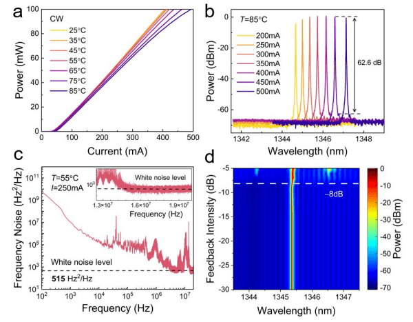 近期,中國科學院半導體研究所材料科學重點實驗室研究員楊濤-楊曉光團隊與研究員陸丹,聯合浙江大學兼之江實驗室教授吉晨,在高功率、低噪聲的量子點DFB單模激光器研究方面取得重要進展。該團隊采用高密度、低缺陷的疊層InAs/GaAs量子點結構作為有源區,結合低損耗側向耦合光柵作為高效選模結構,研制出寬溫區內高功率、高穩定、低噪聲、抗反饋的高性能O波段量子點DFB激光器。在25-85 °C范圍內,激光器輸出功率均大于100 mW,最大邊模抑制比超過62 dB;最低的白噪聲水平僅為515 Hz2 Hz-1,對應的本征線寬低至1.62 kHz;最小平均RIN僅為-166 dB/Hz(0.1-20 GHz)。此外,激光器的抗光反饋閾值高達-8 dB,滿足無外部光隔離器下穩定工作的技術標準。該器件綜合性能優異,兼具低成本、小體積的優勢,在大容量光通信、高速片上光互連、高精度探測等領域具有規模應用前景。