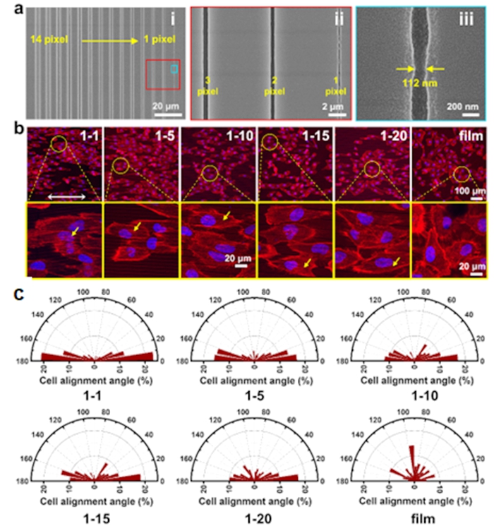 進一步地,受血管和皮膚內表面定向排列結構的啟發,得益于MOPL技術的靈活性和高效性,我們分別制備了凹槽寬度為1 μm,脊線寬度分別為1、5、10、15和20  μm的大面積溝槽陣列結構。通過熒光染色觀察發現,細胞在一系列溝槽陣列結構上形成了沿溝槽方向的肌動蛋白纖維束(圖3b),細胞沿著溝槽取向排列。然而在平面基底上,細胞肌動蛋白纖維束的方向是隨機的,細胞隨機排列。不同尺寸參數的大面積溝槽陣列拓撲結構對細胞行為產生了明顯的調控作用。