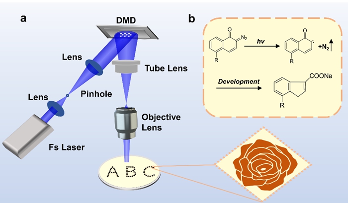 圖1.  飛秒激光無掩膜投影(MOPL)光路示意圖及AZ P4620正膠的光化學反應