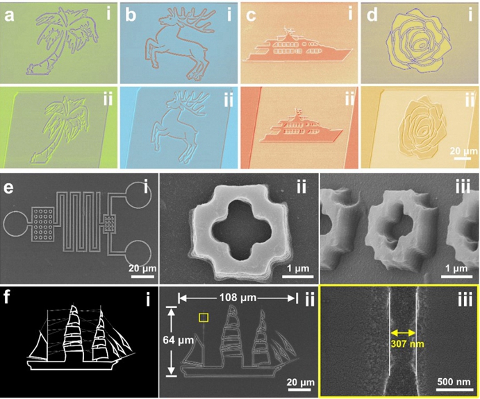 位圖圖形可以實現對DMD的空間光場分布的調制,因此可通過位圖設計來實現多樣化微納結構的制備(圖1)。圖2中展示了基于填充型和輪廓型位圖的圖案化結構、功能性微流道結構以及尺寸在百微米、精度在納米級的跨尺度結構。