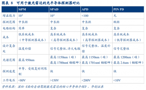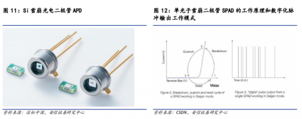 激光雷達(dá)里的探測(cè)器即光電探測(cè)器可分為PINPD(PIN光電二極管)、APD(雪崩式光電二極管)、SPAD(單光子雪崩二極管)、SiPM(硅光電倍增管)四類。APD為當(dāng)前主流。