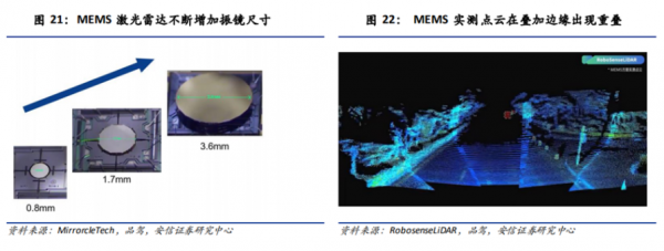 MEMS激光雷達(dá)由于僅有單個(gè)光源而大大減小了器件體積和功耗。其光路結(jié)構(gòu)簡(jiǎn)單,運(yùn)動(dòng)部件減少,可靠性相較機(jī)械式激光雷達(dá)提升很多。同時(shí)減少了激光器和探測(cè)器數(shù)量,成本大幅降低。其壽命在10000至12000小時(shí)以上,可以通過(guò)車規(guī)級(jí)認(rèn)證。其缺點(diǎn)在于振鏡會(huì)造成產(chǎn)品的不穩(wěn)定性:支撐振鏡的懸臂梁角度有限,覆蓋面很小,所以需要多個(gè)雷達(dá)進(jìn)行共同拼接才能實(shí)現(xiàn)大視角覆蓋,這就會(huì)在每個(gè)激光雷達(dá)掃描的邊緣出現(xiàn)不均勻的畸變與重疊,不利于算法處理。另外,懸臂梁很細(xì),機(jī)械壽命也有待進(jìn)一步提升。