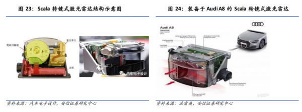 轉(zhuǎn)鏡激光雷達(dá)最早應(yīng)用于車規(guī)級(jí)產(chǎn)品,目前是最主流的半固態(tài)方案。轉(zhuǎn)鏡方案固定了收發(fā)模組,用360°高速旋轉(zhuǎn)的多面棱形反射鏡來(lái)反射光束,完成激光雷達(dá)視野范圍內(nèi)全視場(chǎng)角掃描。轉(zhuǎn)鏡的優(yōu)點(diǎn)在于棱鏡、電機(jī)和發(fā)射器有更好的耐熱性和耐用性,因此更容易過(guò)車規(guī),當(dāng)前Valeo的運(yùn)用轉(zhuǎn)鏡方案的Scala1已經(jīng)通過(guò)車規(guī)認(rèn)證。轉(zhuǎn)鏡被視為機(jī)械式向純固態(tài)進(jìn)軍的必經(jīng)之路,是短期上車主流,且未來(lái)很長(zhǎng)一段時(shí)間半固態(tài)和純固態(tài)都將并行。