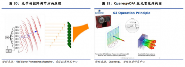 光學(xué)相控陣技術(shù)(OPA)通過(guò)施加電壓調(diào)節(jié)每個(gè)相控單元的相位關(guān)系,利用相干原理實(shí)現(xiàn)發(fā)射光束的偏轉(zhuǎn),從而完成系統(tǒng)對(duì)空間一定范圍的掃描測(cè)量。雷達(dá)精度可以做到毫米級(jí),且順應(yīng)了未來(lái)激光雷達(dá)固態(tài)化、小型化以及低成本化的趨勢(shì),但難點(diǎn)在于如何把單位時(shí)間內(nèi)測(cè)量的點(diǎn)云數(shù)據(jù)提高以及投入成本巨大等問(wèn)題,目前OPA產(chǎn)業(yè)鏈尚處于起步階段,真正投入使用的主要是美國(guó)的Quanergy公司。
