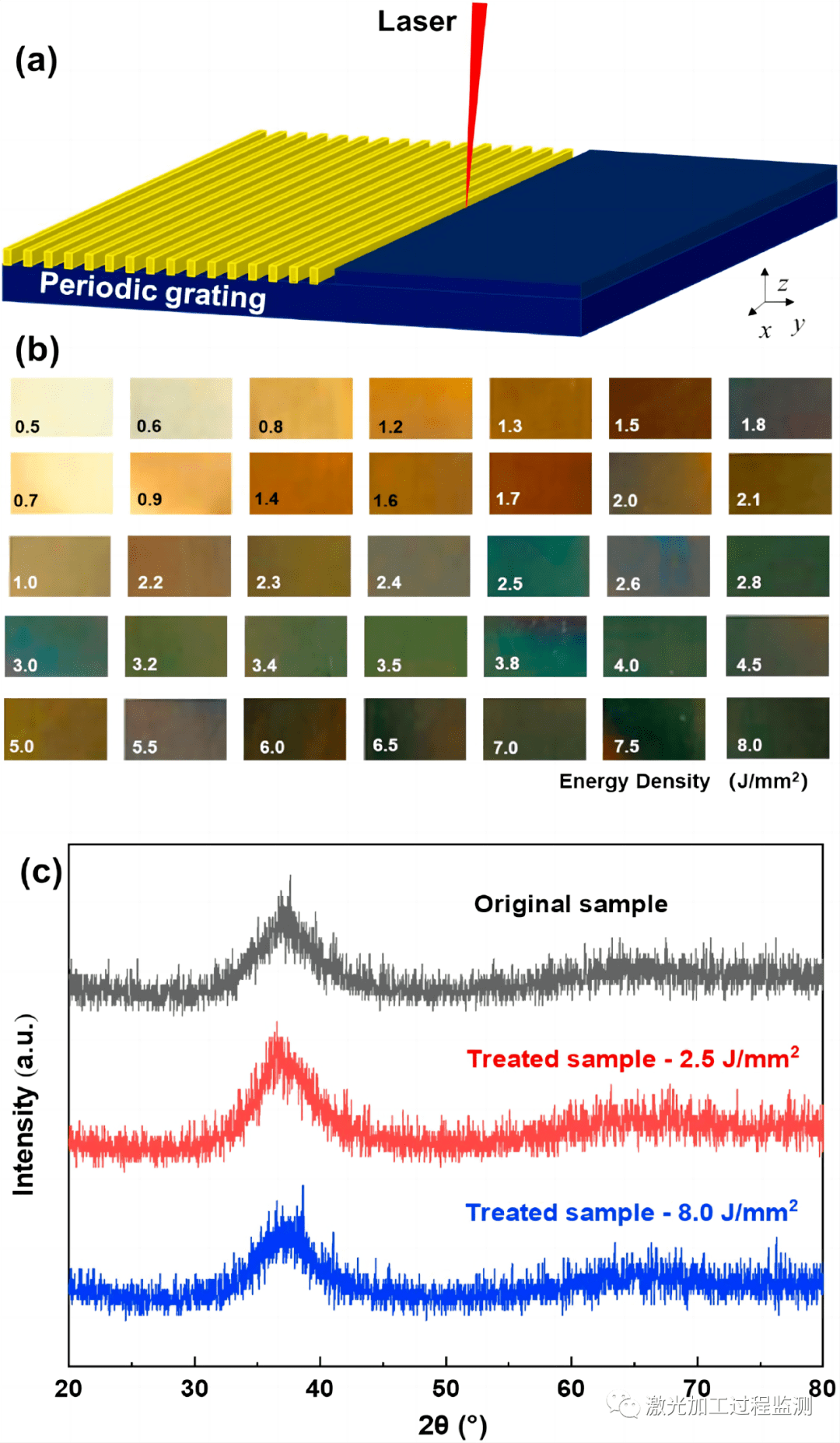圖5.(a)激光加工周期性表面光柵結構的三維示意圖,(b)能量密度變化與顏色變化的關系示意圖,(c)未處理、2.5J/mm2和8.0J/mm2處理的XRD圖譜。