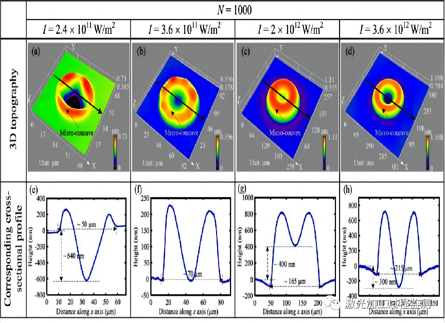 圖10.在各種峰值激光功率強度下獲得的激光燒蝕區域的3D拓撲,(e)–(h)為圖3(a)–(d)中標記線的橫截面剖面圖,實驗的激光脈沖數量均為1000。