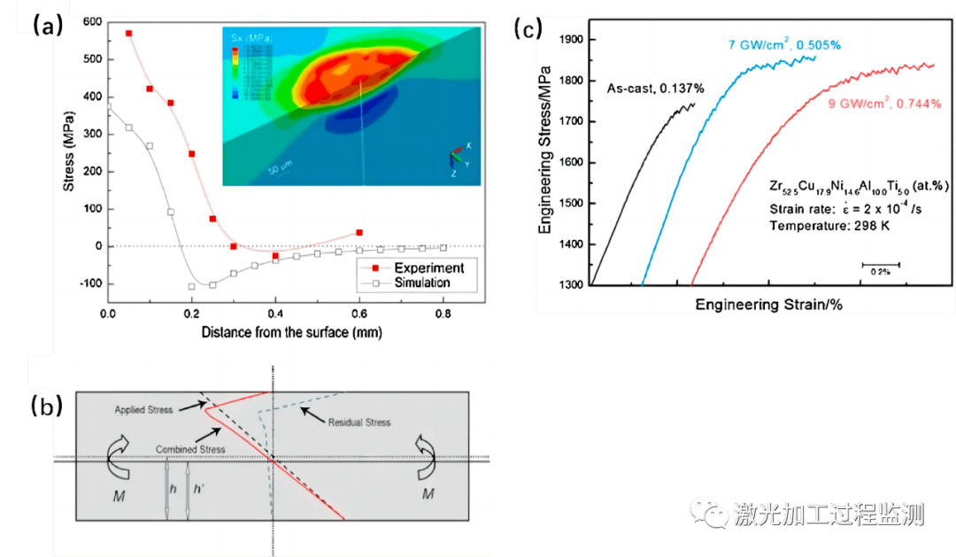 圖14.(a)激光處理BMG棒材表面殘余應力的模擬和(b)彎曲過程中力的示意圖,(c)不同激光強度處理樣品的應力應變曲線,曲線右側出現斷裂。
