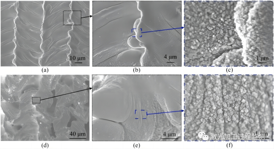 圖12.(a)-(c)是0.649W的較高平均功率下的形態。(d)–(f)是較低掃描速度1mm/s下的形態。