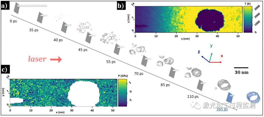 圖1.分子動力學模擬顯示了超短激光照射下Zr-Cu金屬玻璃表面納米空腔的發展,峰值能量F=0.06J/cm2和一次激光射擊。輻照模擬開始后165ps納米孔周圍溫度和c壓力的演變。