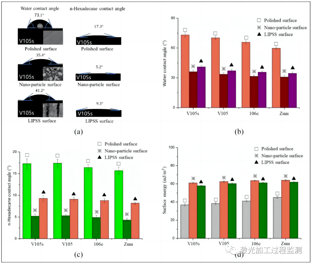 圖7.(a)不同結構V105s表面的接觸角變化,(b)試樣的水接觸角變化,(c)正十六烷試樣的接觸角變化,(d)試樣的表面能變化;誤差條表示基于每個樣本不同區域的三個測量值的標準偏差。