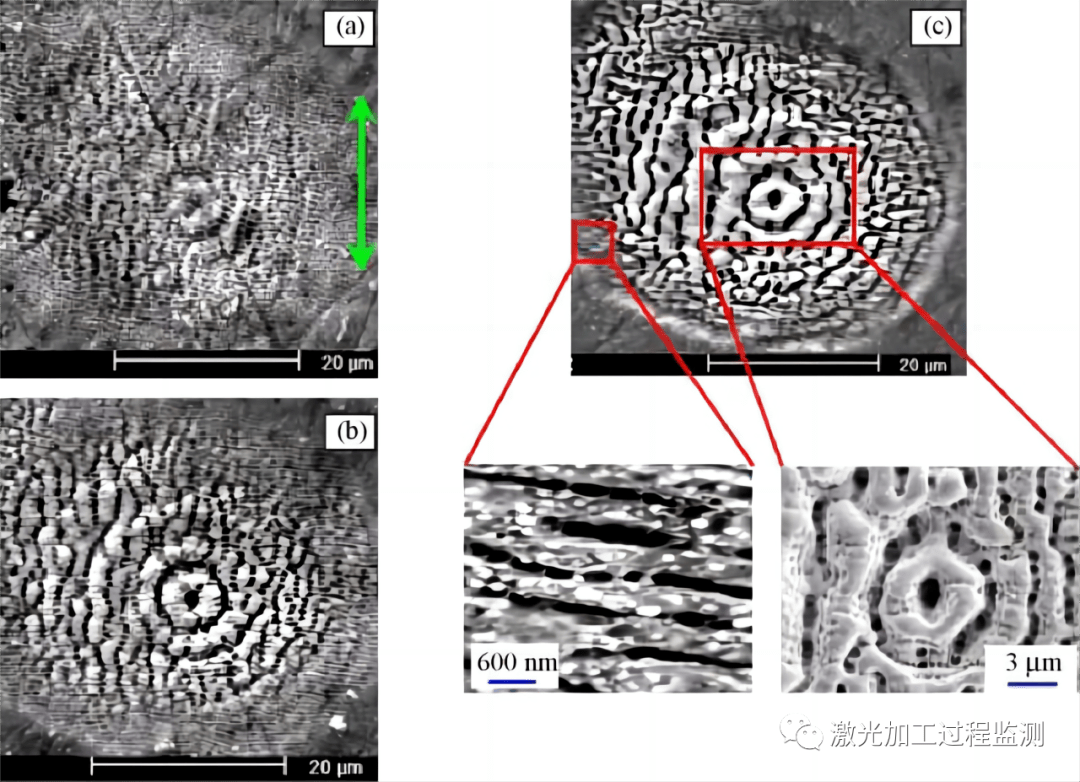 圖4.多脈沖飛秒激光器在0.18J/cm2的低能量通量下照射的樣品的表面形態.(a)N=10,(b)N=30和(c)N=100。