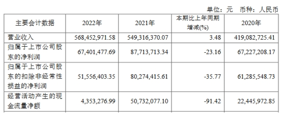 2022年,公司營業收入5.68億元,同比增長3.48%;歸屬于上市公司股東的凈利潤6740.15萬元,同比下降23.16%;歸屬于上市公司股東的扣除非經常性損益的凈利潤5155.64萬元,同比下降35.77%;經營活動產生的現金流量凈額435.33萬元,同比下降91.42%。